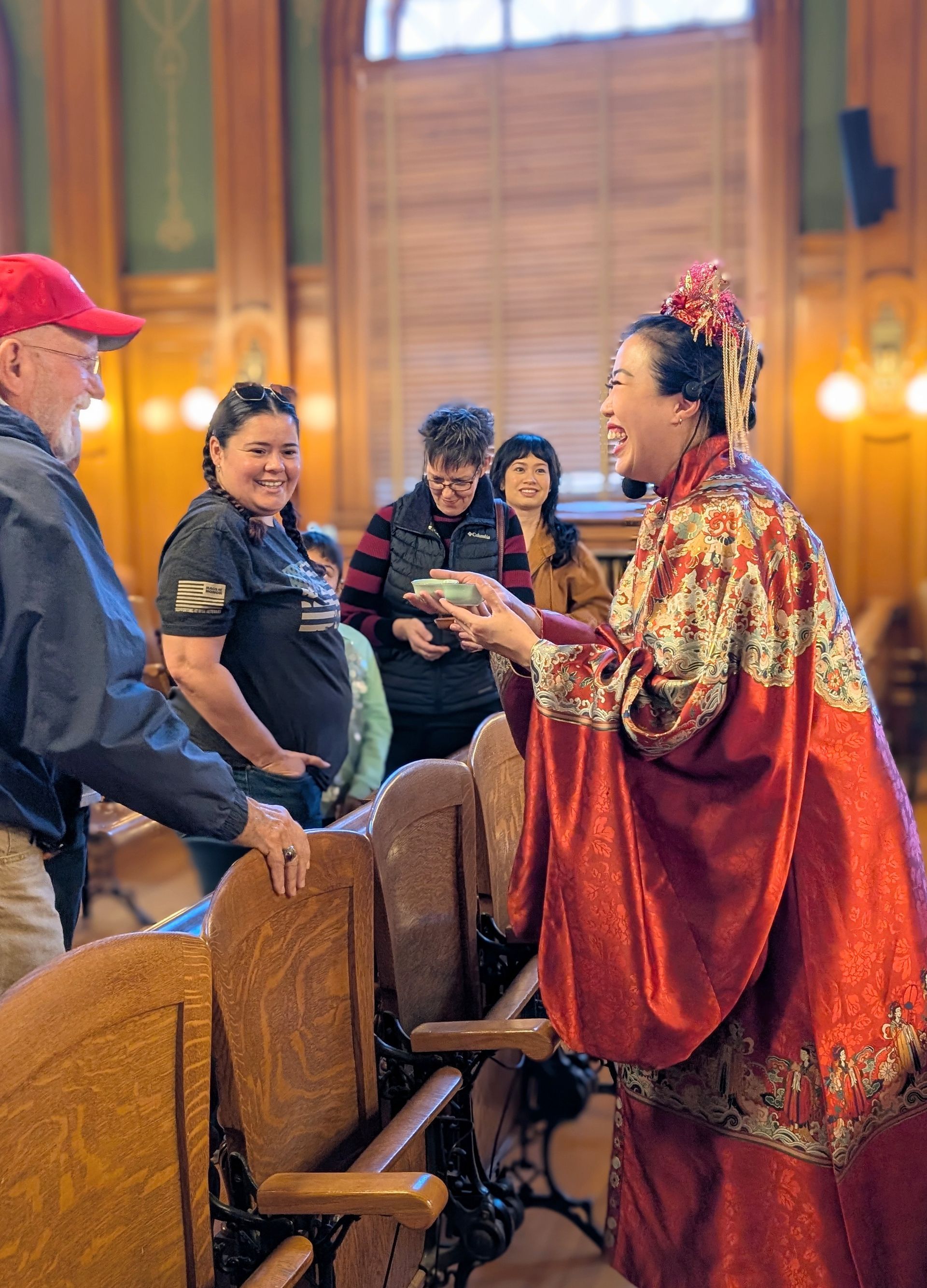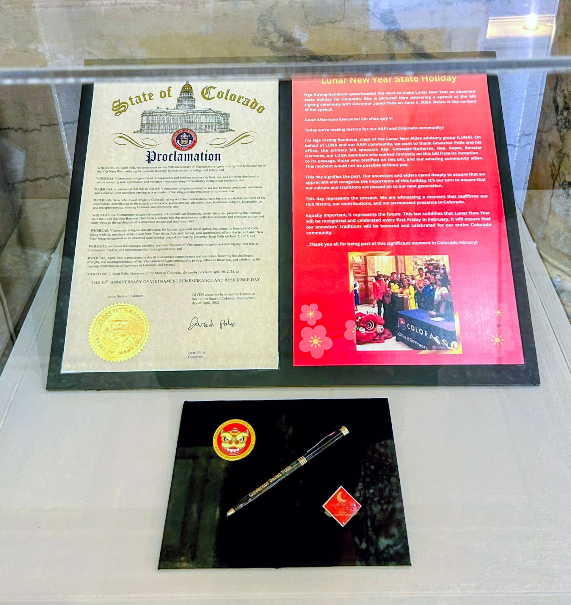 The event also marked a historic moment: the unveiling of a new exhibit honoring the journey that made Lunar New Year an official Colorado state holiday, the second in the nation. The display highlights the leadership of Nga Vương-Sandoval, Founding Executive Director of Refugees + Immigrants United, who spearheaded the effort as Founder and Chair of Lunar New Year Allies Advisory Group (LUNA). Artifacts on display include her bill-signing remarks, the pen used by Colorado Governor Jared Polis to sign the legislation, and limited edition commemorative pins from its passage on June 2, 2023 and a special edition pin for LUNA members, preserving this significant milestone for AAPI communities and future generations.